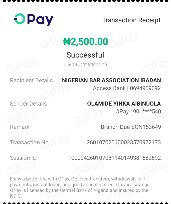 38 | Adebimpe Elijah Adelowo | 2009 | SCN070566 | bimpe@nigerianbar.ng | 08064365674 | N12,500 | 01/01/2026 | ||||