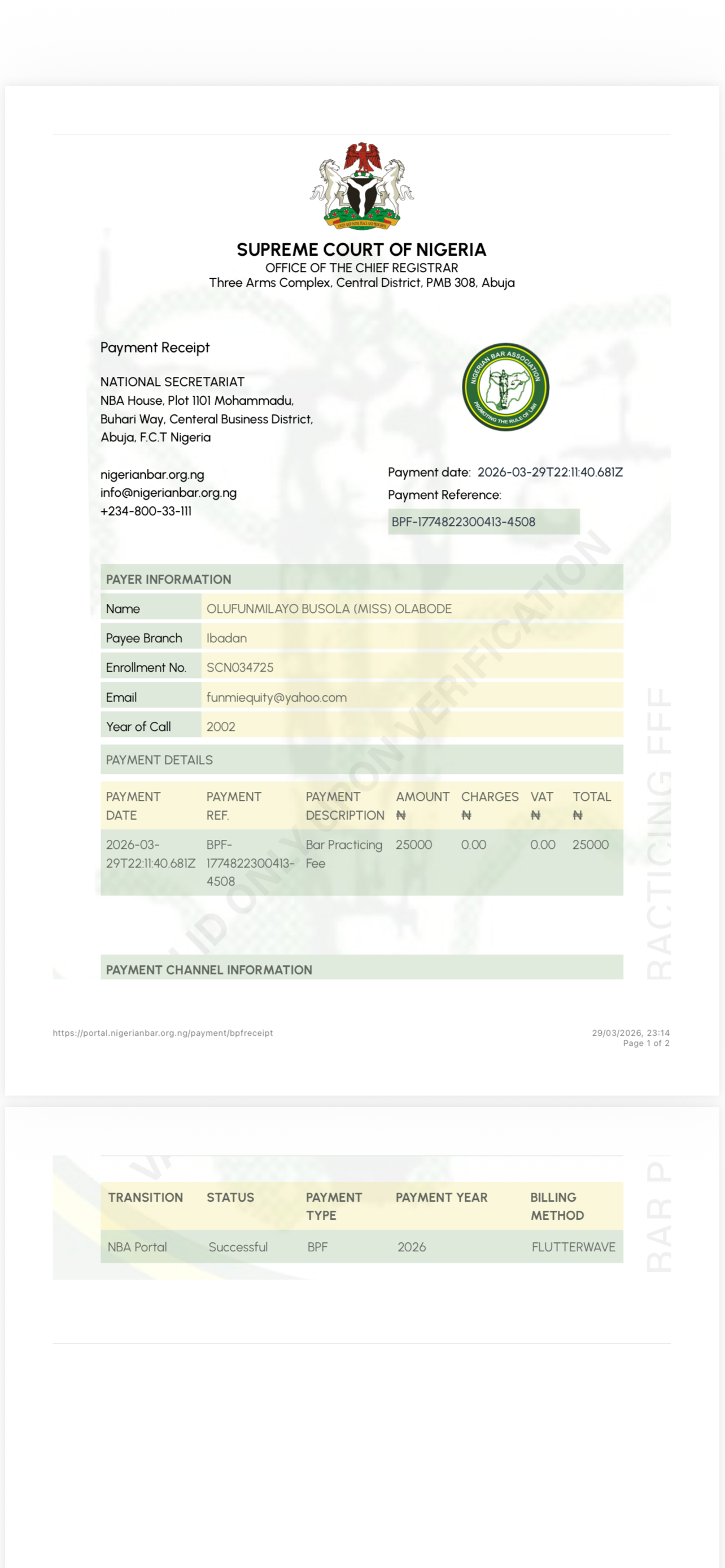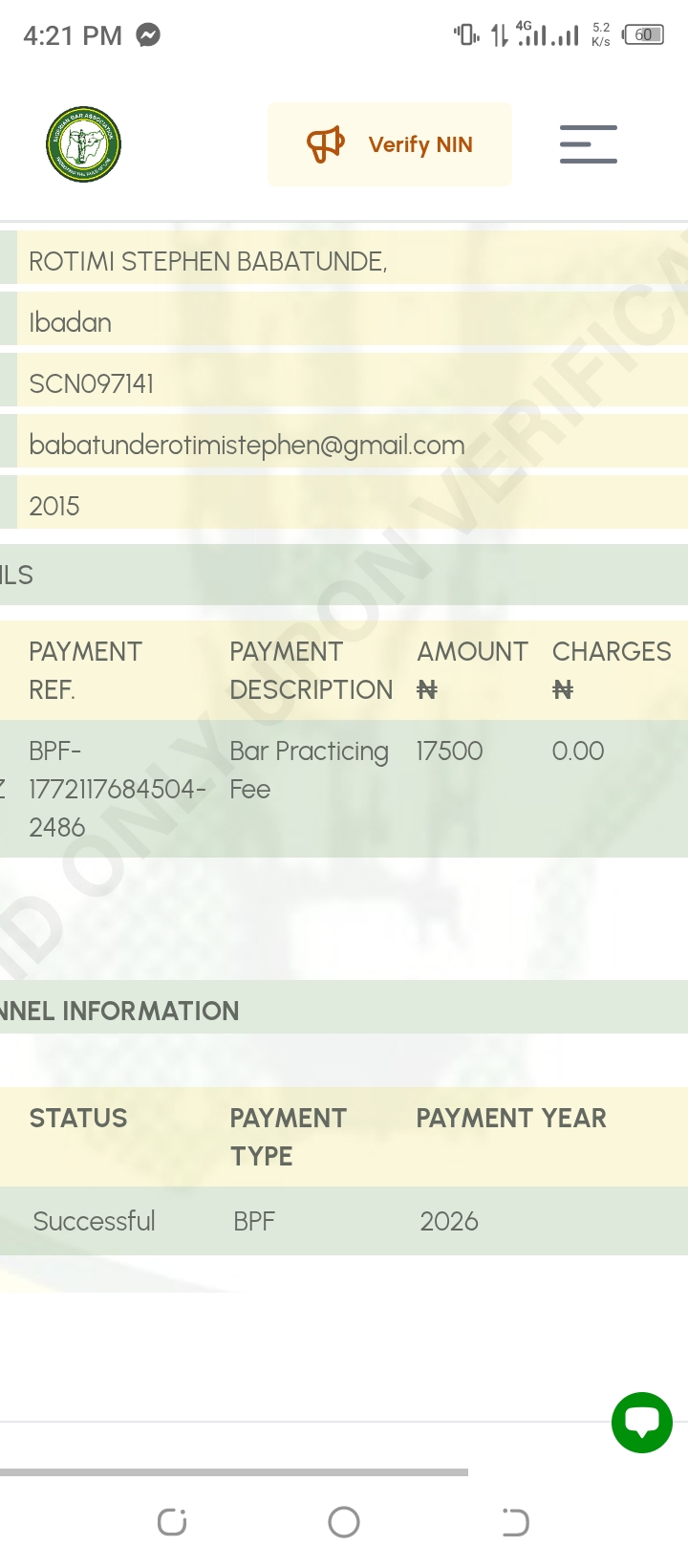 26 | Folorunso Akinade Ahmed | 2007 | SCN055746 | ahmedlaw2003@gmail.com | 07072279060 | N12,500 | 12/01/2026 | i paid N1500 for membership ID card Thanks. | |||