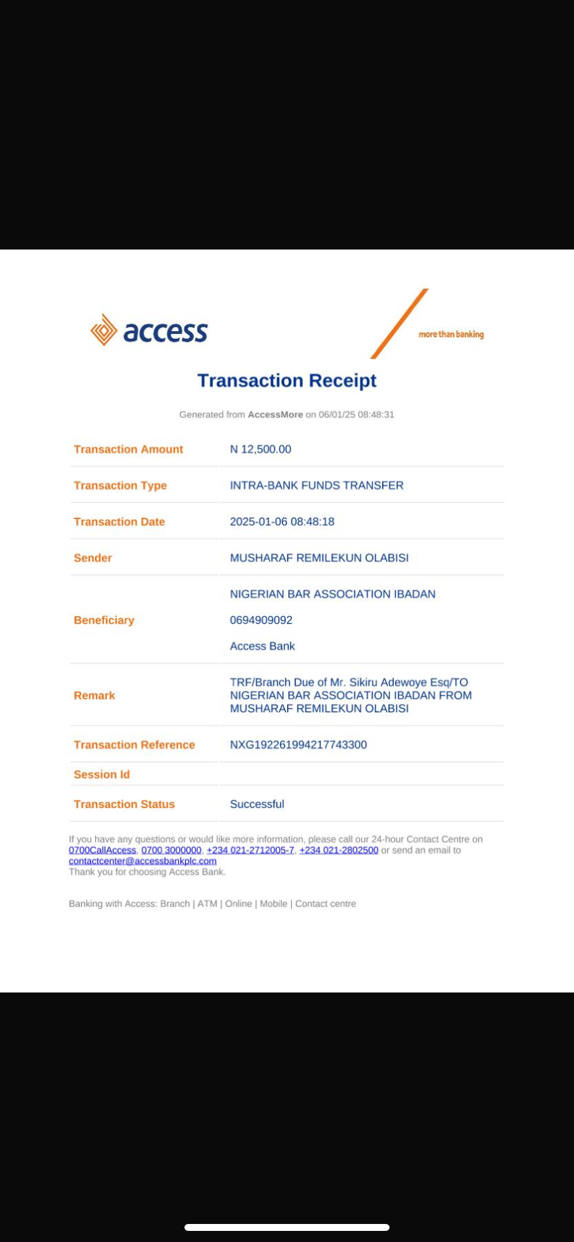 917 | ADEBOWALE YINUSA BOLADALE | 2004 | SCN045078 | debolex1971@gmail.com | 07033983888 | 12500 | 15th January, 2025 | The Branch dues was transferred from the account of a counsel in chamber. The payment is made on my behalf, ADEBOWALE YINUSA BOLADALE | |||