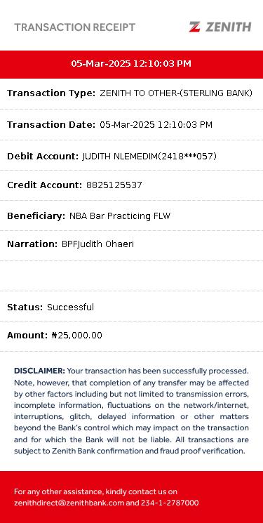 148 | LAWAL FRANCIS ADENIYI | 2003 | SCN037394 | francelaw2005@yahoo.com | +08023509485 | 12500 | 11th March ,2025 | ||||